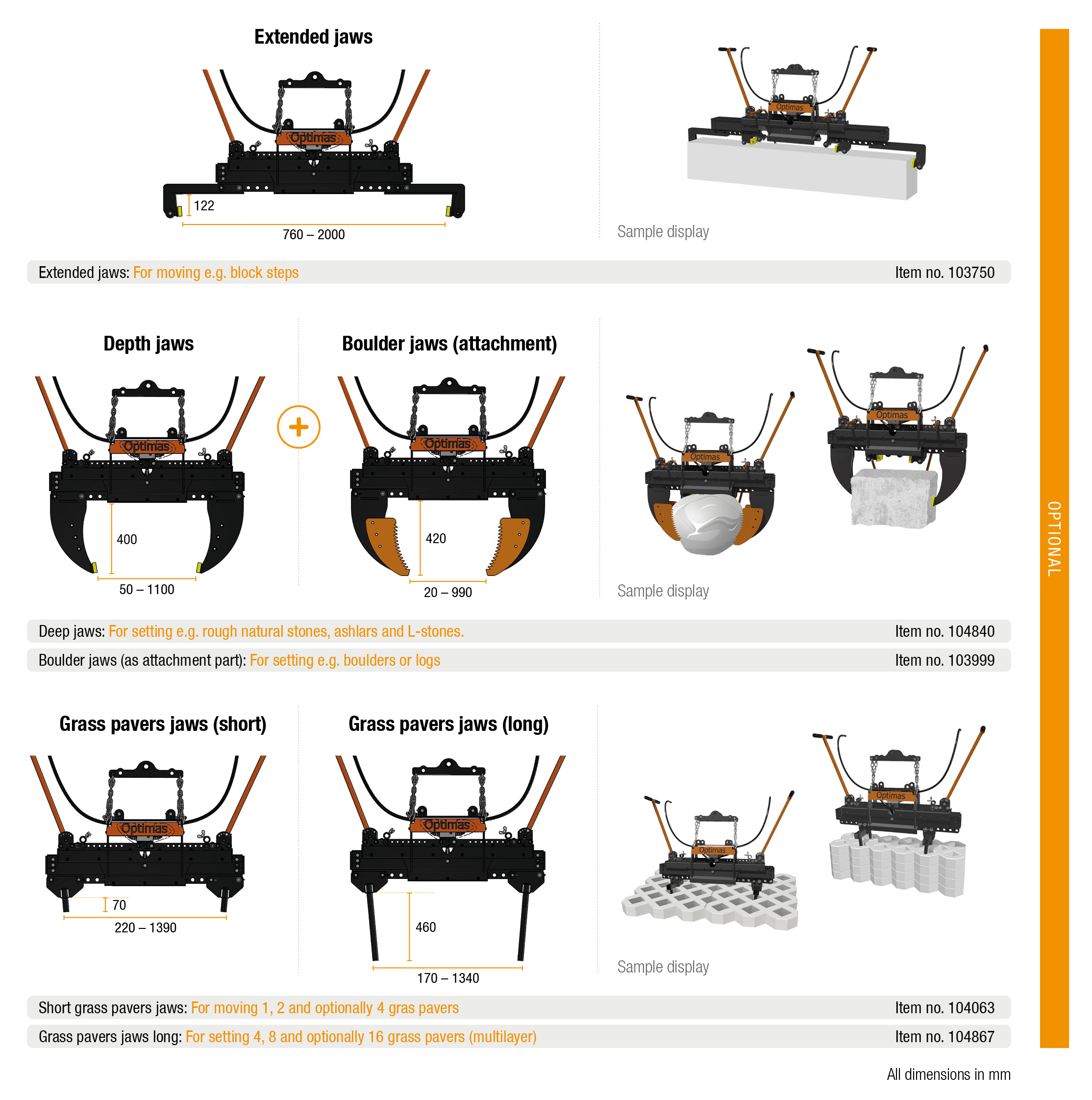 Various gripping jaws available for palisades, L-stones, block steps, natural stones, lawn grids, boulders and many more.