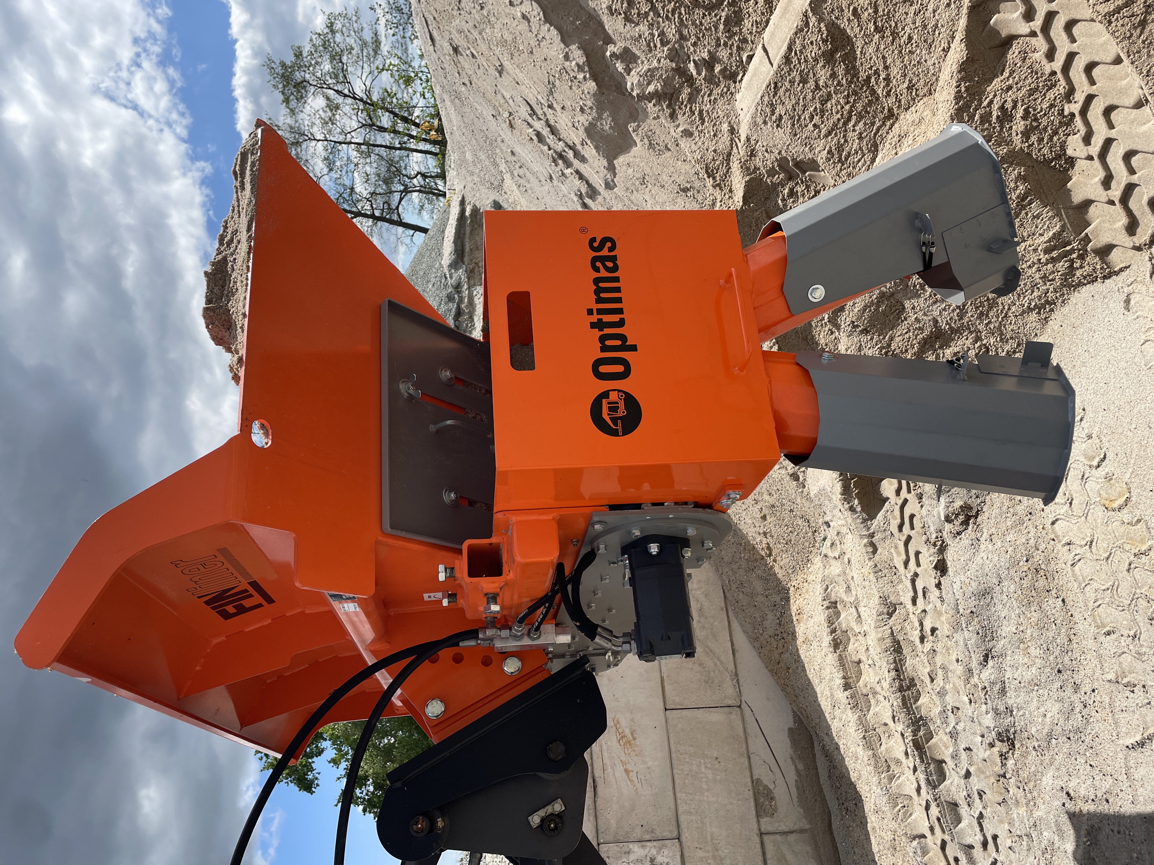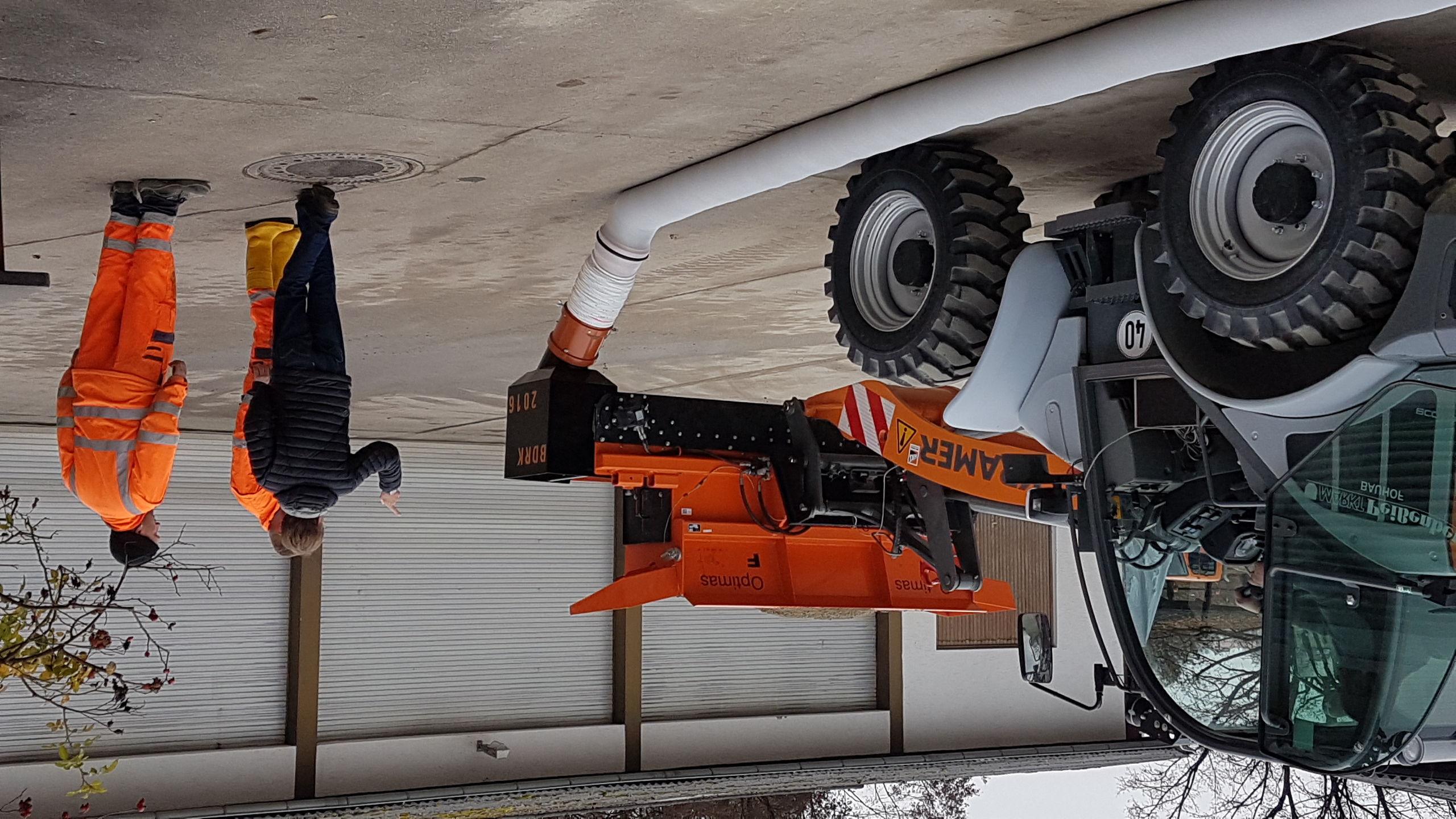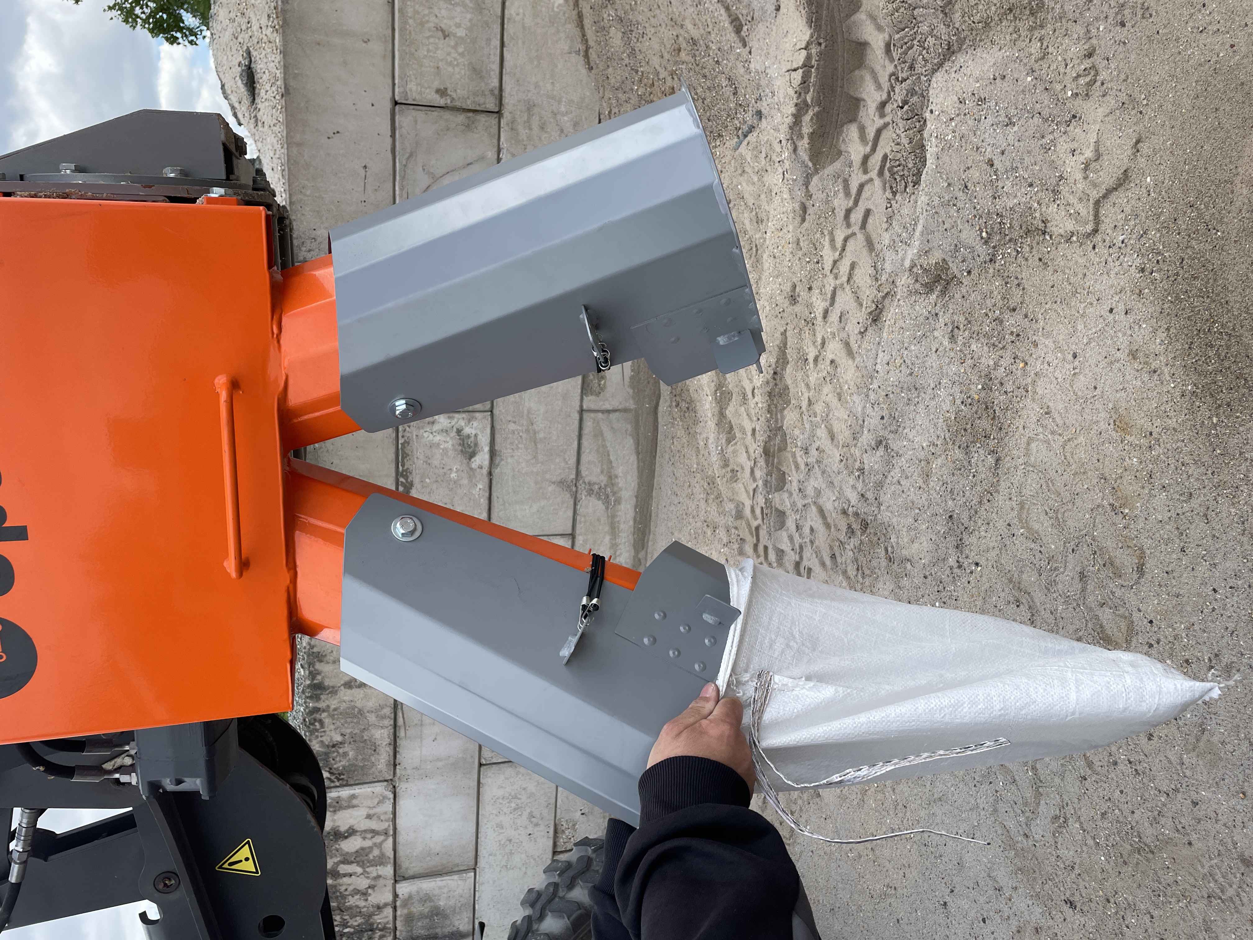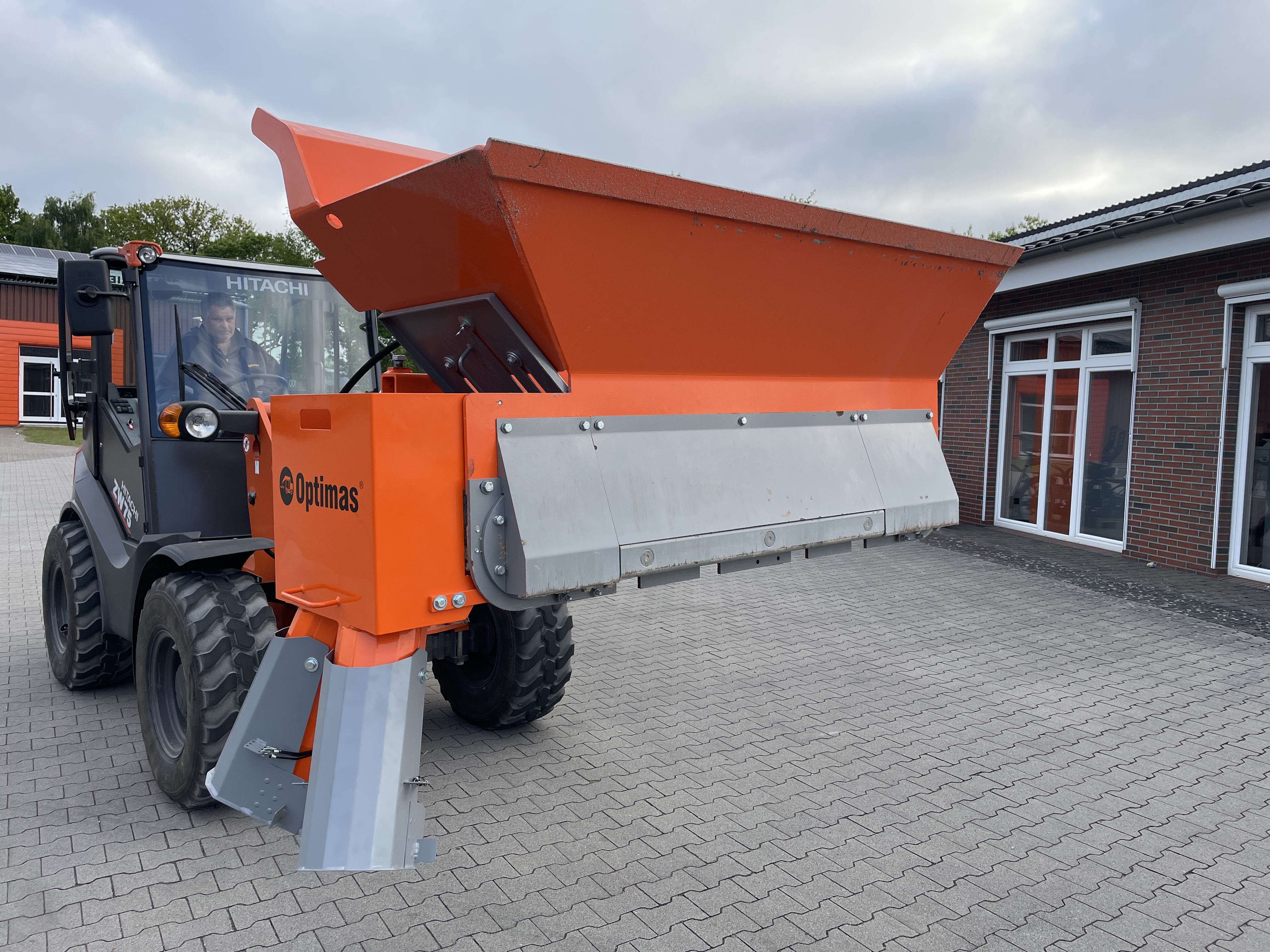 The Finliner can pick up and distribute many different materials. Concrete, asphalt, bulk materials (sand, chippings, gravel, topsoil, salt, wood chips, pebbles, etc.) are ejected from the side using a conveyor belt. The amount of material can be precisely dosed by the speed of the conveyor belt and the travelling speed. The travelling speed is not relevant when filling big bags, sandbags or hoses. The Finliner from Optimas is the favourable alternative to a swivel loader or side tipping bucket. The Finliner is mounted on the wheel loader using the matching quick-release plate.