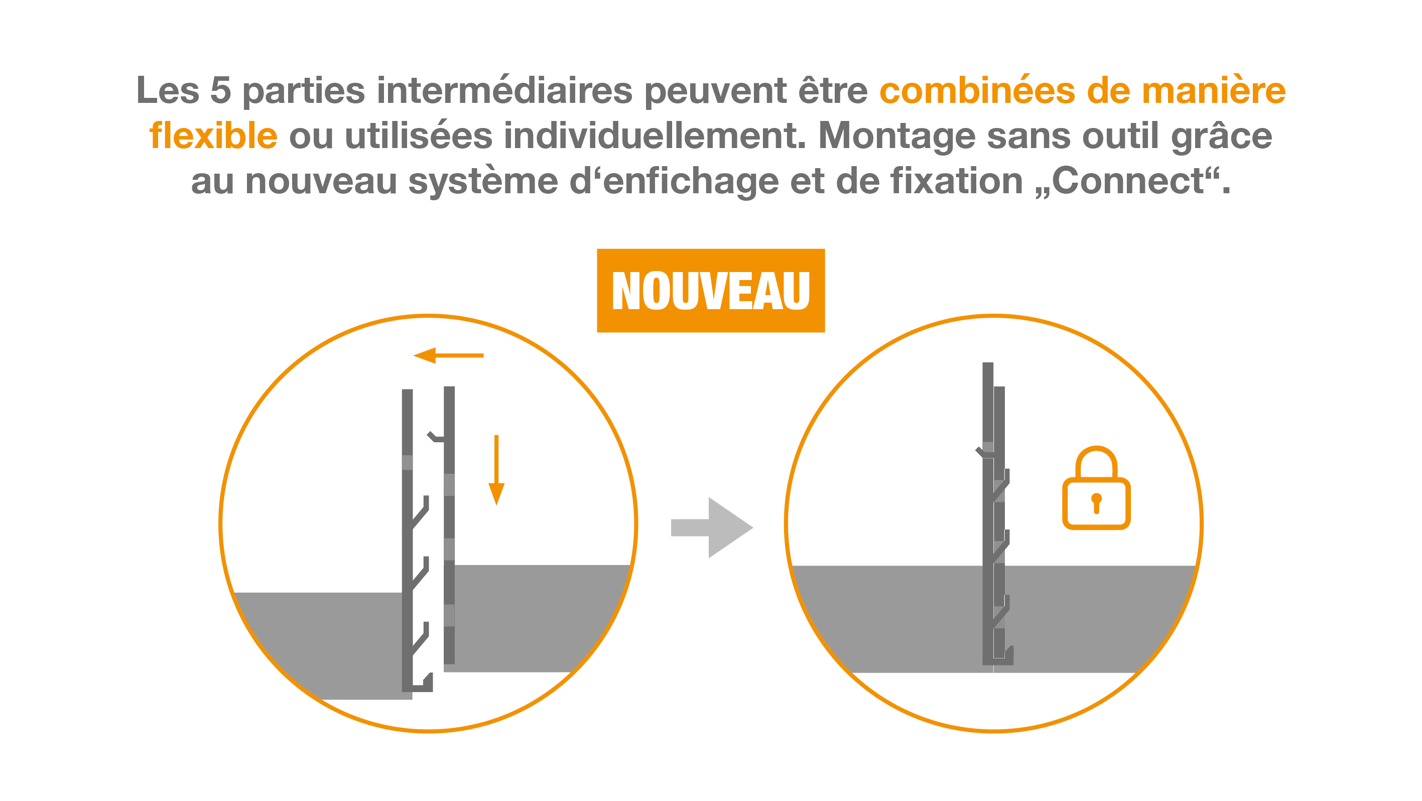 | Rails de niveau: | Galvanisé, avec connecteur enfichable, livrable en longueurs 4, 3, 2 et 1 m |