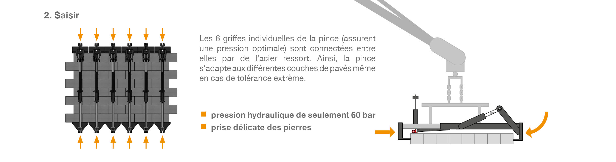 - La technique de pince intelligente à 6 griffes nécessite une pression hydraulique de 60 bars seulement. Préhension et pose en douceur.