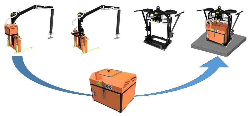 L'unité de pompe à vide peut être facilement démontée et utilisée indépendamment comme un Vacu-Magnet. Il suffit de le monter dans le cadre Vacu-Magnet (en option) et de soulever des poids jusqu'à 1 000 kg.