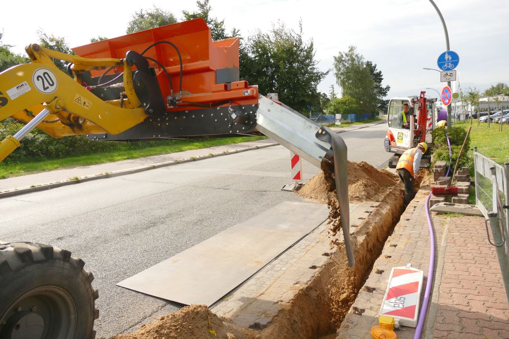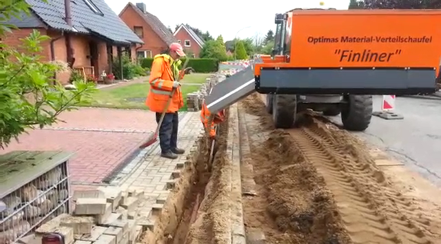 Auch im Bereich Leitungsbau findet die Material-Verteilschaufel „Finliner“ ihren Einsatz. Sie eignet sich ideal zum Absanden von Gräben und Leitungen!