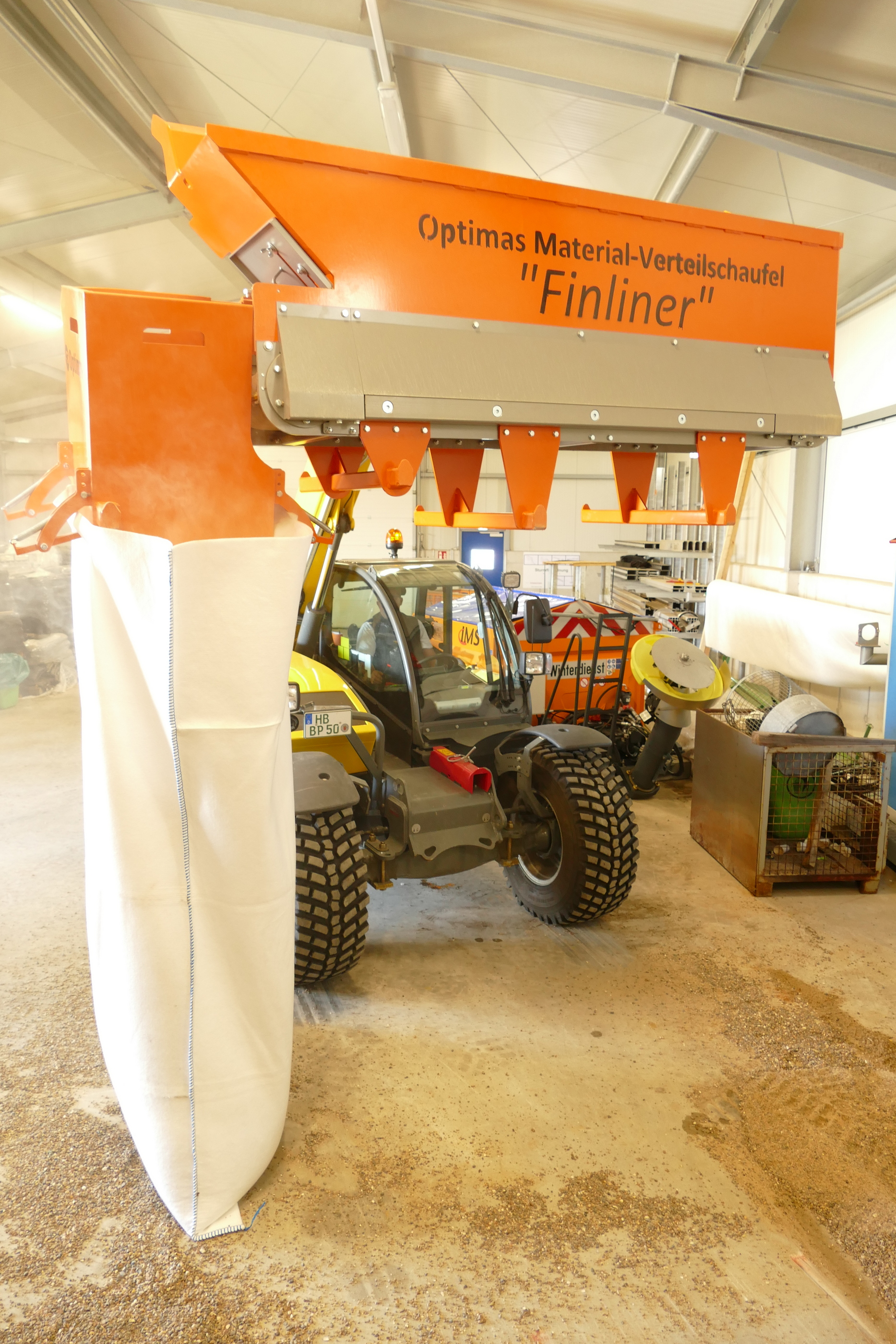 Der „Finliner“ ist eine Material-Verteilschaufel von 2 m Breite, die hydraulisch betrieben wird. Die Länge des Förderbandes, das das Material aus der Schaufel transportiert, beträgt 2,50 m. Trägergerät ist ein Radlader gleich welchen Fabrikates. Der Anbau per Schnellwechsler ist in einer Minute geschehen. Ist der „Finliner“ montiert, kann er um 90° nach vorn geschwenkt werden, um Material aufzunehmen. Bis zu 1 m³ fasst das Gerät. Es kann aber auch von einem anderen Radlader oder Lkw direkt beschickt werden. Die Öffnung des „Finliner“ ist so geformt, dass kein Material danebenfallen kann. Der Finliner streut seitlich, während der Radlader geradeaus fährt. Die Dosierung des Füllgutes wird durch die Geschwindigkeit des Förderbandes und die Fahrgeschwindigkeit des Radladers gesteuert. Die „Finliner“ Material-Verteilschaufel gibt es auch in einer größeren Ausführung mit 1,4 m³ Fassungsvermögen. Diese Variante steht dann auf Rollen und ist hauptsächlich im Bankettbau im Einsatz.