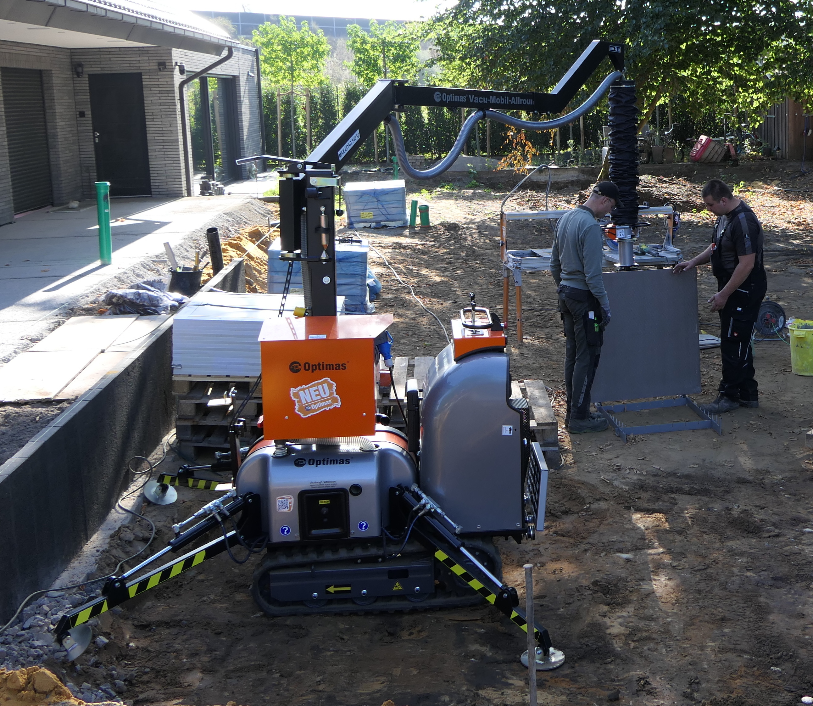 „Körper schonend zu arbeiten ist ein wichtiger Leitgedanke für uns. Mit dem Vacu-Mobil-Allrounder können wir das verwirklichen“, sagt Uli Baumeister, Geschäftsführer der Baumeister Galabau GmbH aus Raesfeld im Münsterland. Bei einer sehr umfangreichen Gartengestaltung in Borken verlegt Baumeister zurzeit 1 m x 1 m x 2 cm italienische Keramikfliesen. Da muss vorsichtig gearbeitet werden, denn die kosten insgesamt einen sechsstelligen Betrag. Eine Platte wiegt 45 kg plus Kleber und muß über mehrere Meter bewegt werden. Bei solchen Aufgaben zeigt der Optimas VMA wie es problemlos funktioniert.