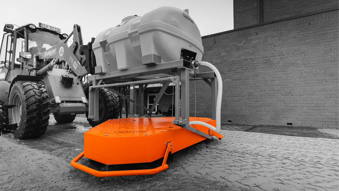 Grundsätzlich kann sowohl trocken als auch mit dosierbarer Wasserzufuhr eingekehrt werden. Die Wasserzufuhr wird über ein Elektro-Ventil geregelt. Im Lieferumfang ein 1.000 ltr Speidel-Wassertank. Im Verhältnis zu Standardfässern ein sehr geringer Aufbau. Dadurch sehr gute Sicht für den Bediener.