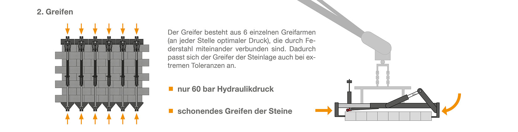 - Durch die intelligente 6-Arm Greiftechnik nur 60 bar Hydraulikdruck nötig. Sehr schonendes Greifen und Ablegen der Steine.