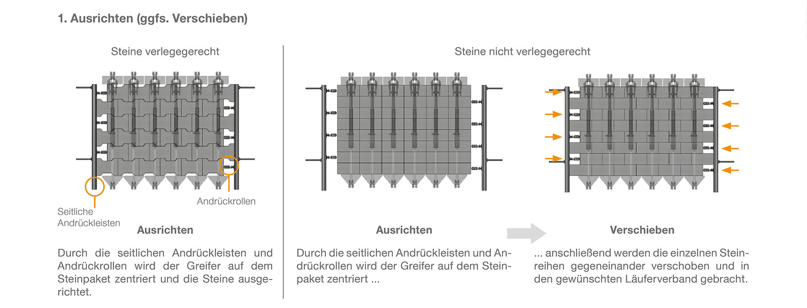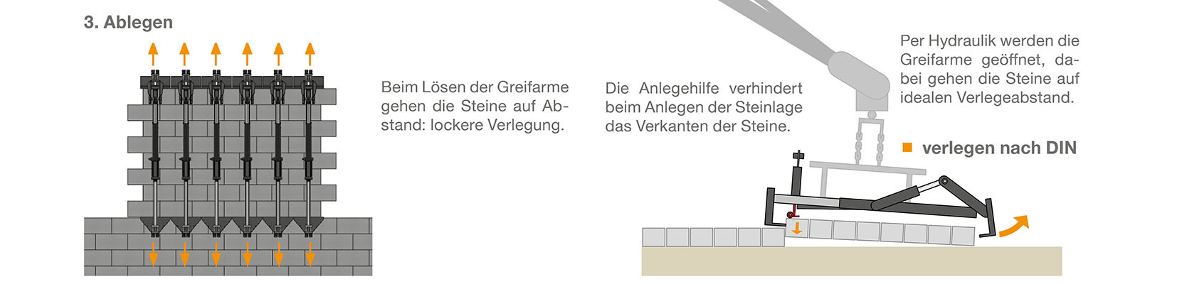 - Lieferbar für Ein- und Zwei-Hydraulik-Kreislauf-Geräte. Serienmäßig mit Anlegehilfe. Die verhindert das Verkanten der Steine beim Ablegen.