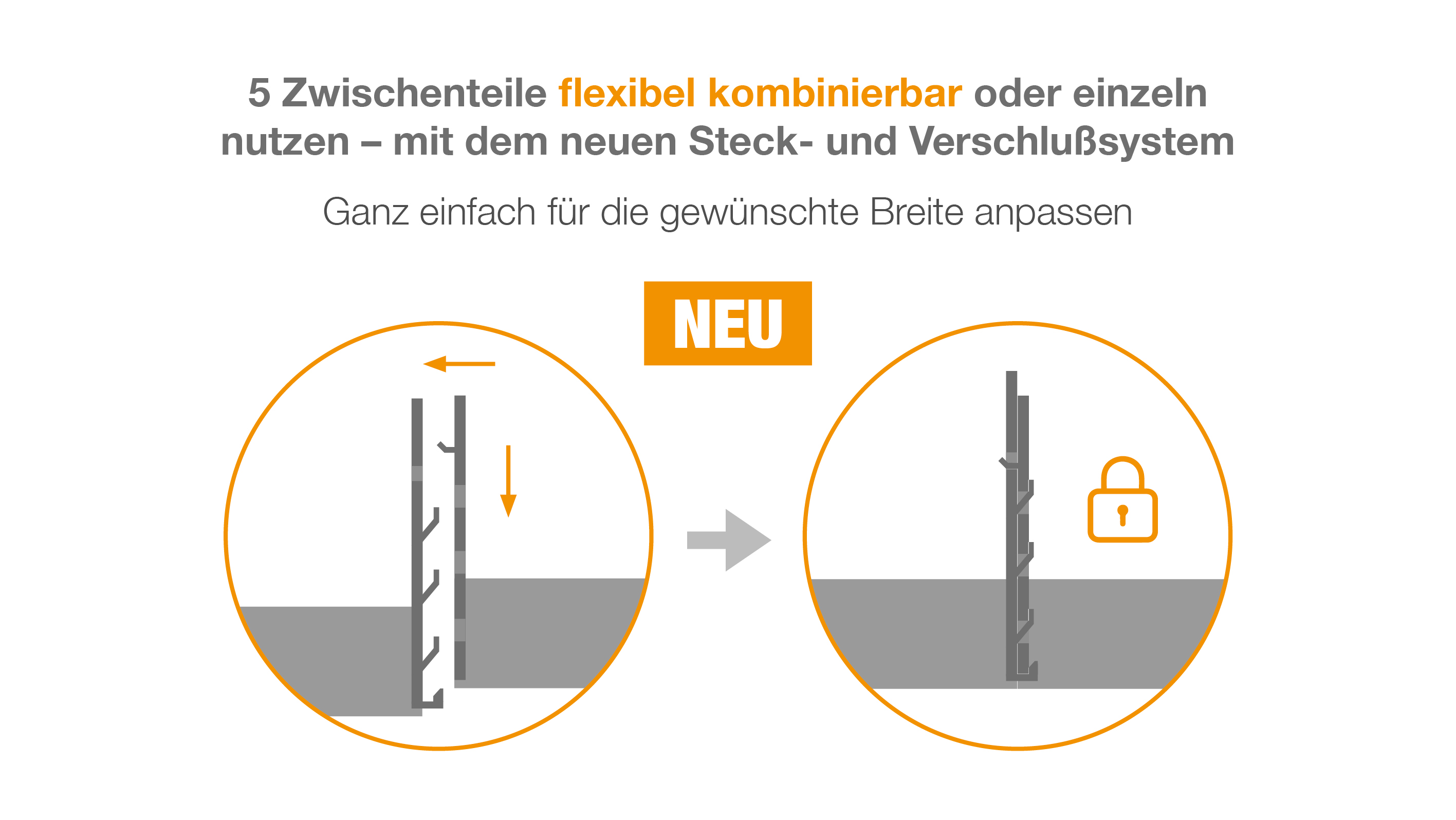 - Einfaches und schnelles Auswechseln und Montieren von unterschiedlichen Zwischenteilen